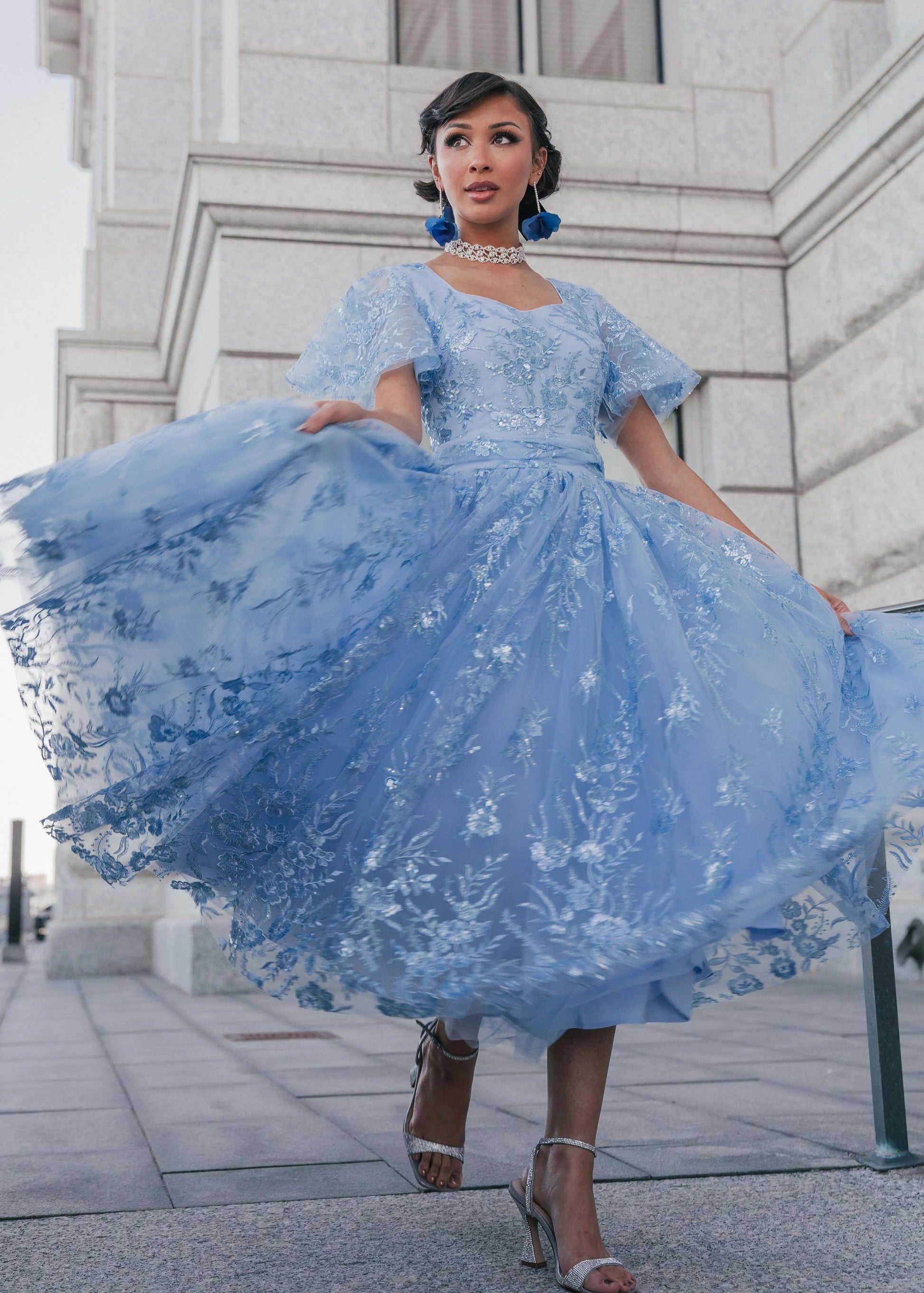 Embellished with delicate and shimmering floral sequins, this dress glistens like freshly fallen snow in the morning sun. The subtle yet mesmerizing details add a touch of magic to your look. Don't miss the opportunity to create your very own winter fairytale this season.
