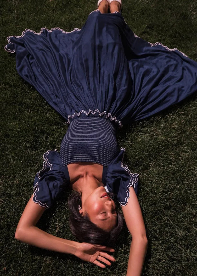 The Helen Dress is a captivating piece that combines elegance with a touch of whimsy. Its deep navy blue fabric is beautifully contrasted by intricate white scalloped detailing along the hem and sleeves, creating a striking visual effect. The smocked bodice and fluttery sleeves enhance the dress's feminine charm, while the flowing skirt provides a graceful and airy feel. Perfect for any occasion, this dress is designed to make you feel effortlessly stylish and comfortable.