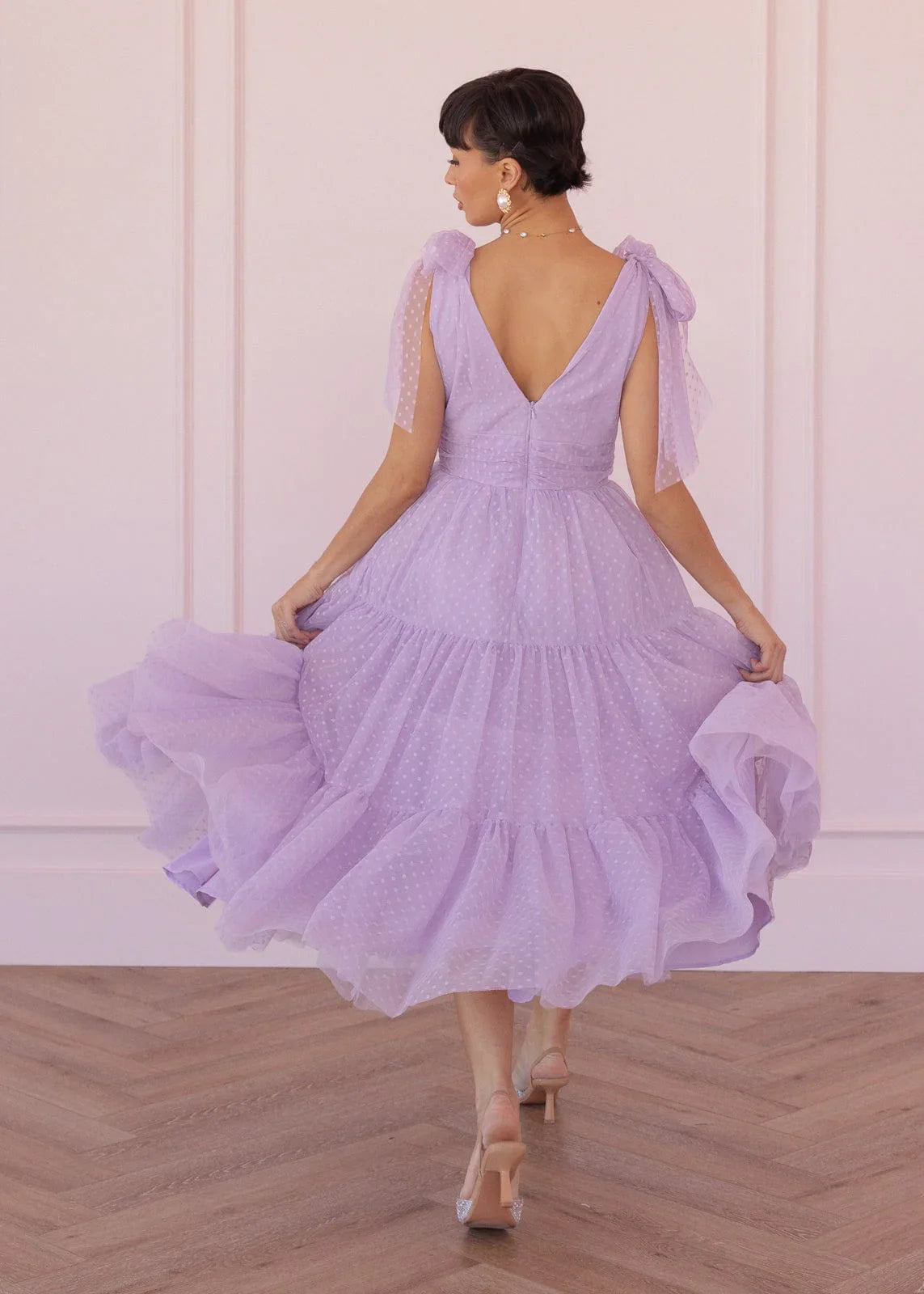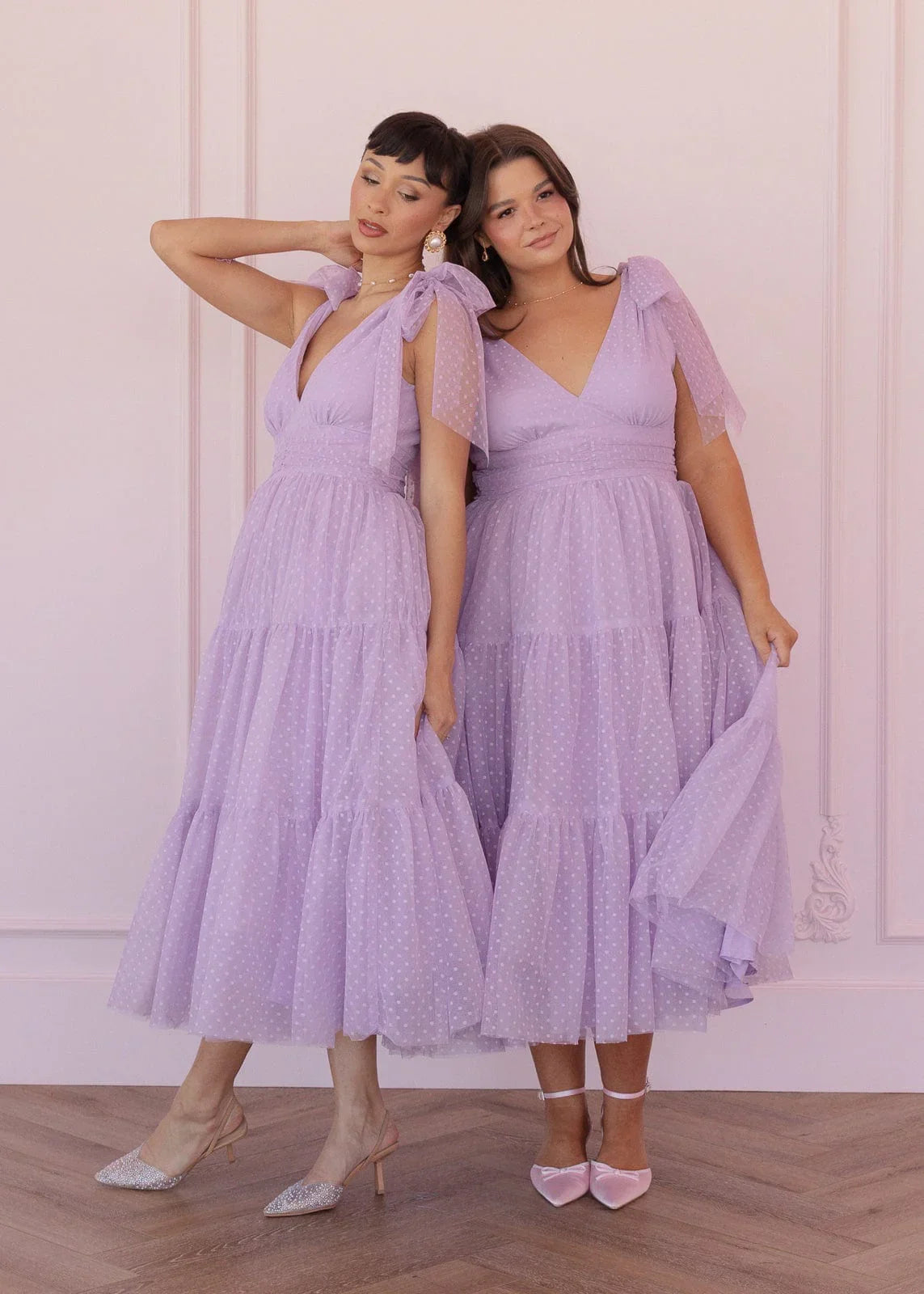 The Jeanne Dress is the definition of whimsical charm, featuring soft dotted tulle and an effortlessly romantic tiered skirt. Its delicate shoulder bows and flattering ruched waistband bring a fairytale feel to every step. The dreamy lavender hue makes it perfect for spring soirées, bridal events, or simply twirling through a sunlit afternoon. With a silhouette that flatters and details that enchant, Jeanne is made for your most magical moments.