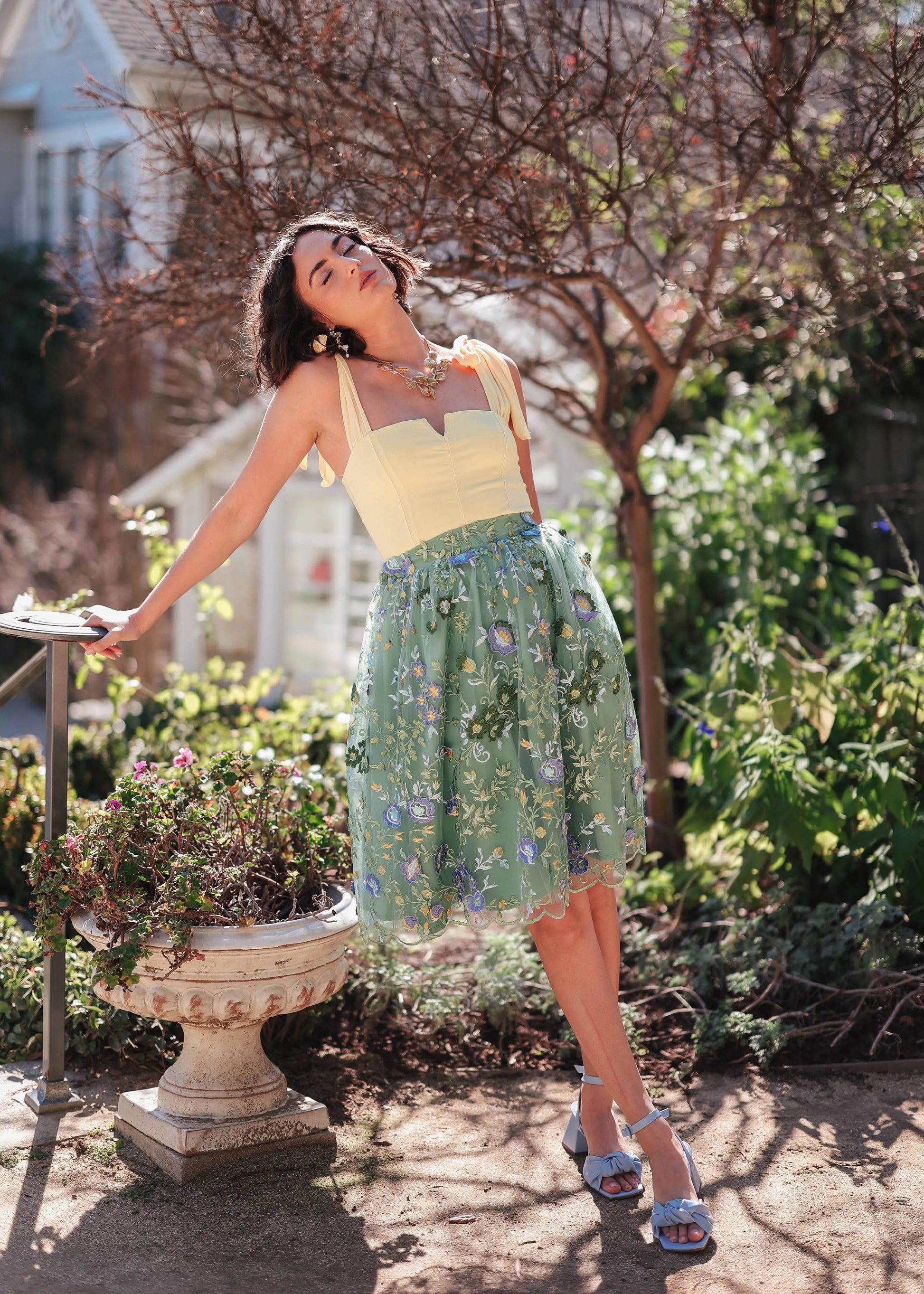 Adorned with intricate blue, yellow, and green floral appliqués, this skirt is perfect for elevating your spring/summer wardrobe and making a statement at any occasion. Perfectly paired with your favorite top.