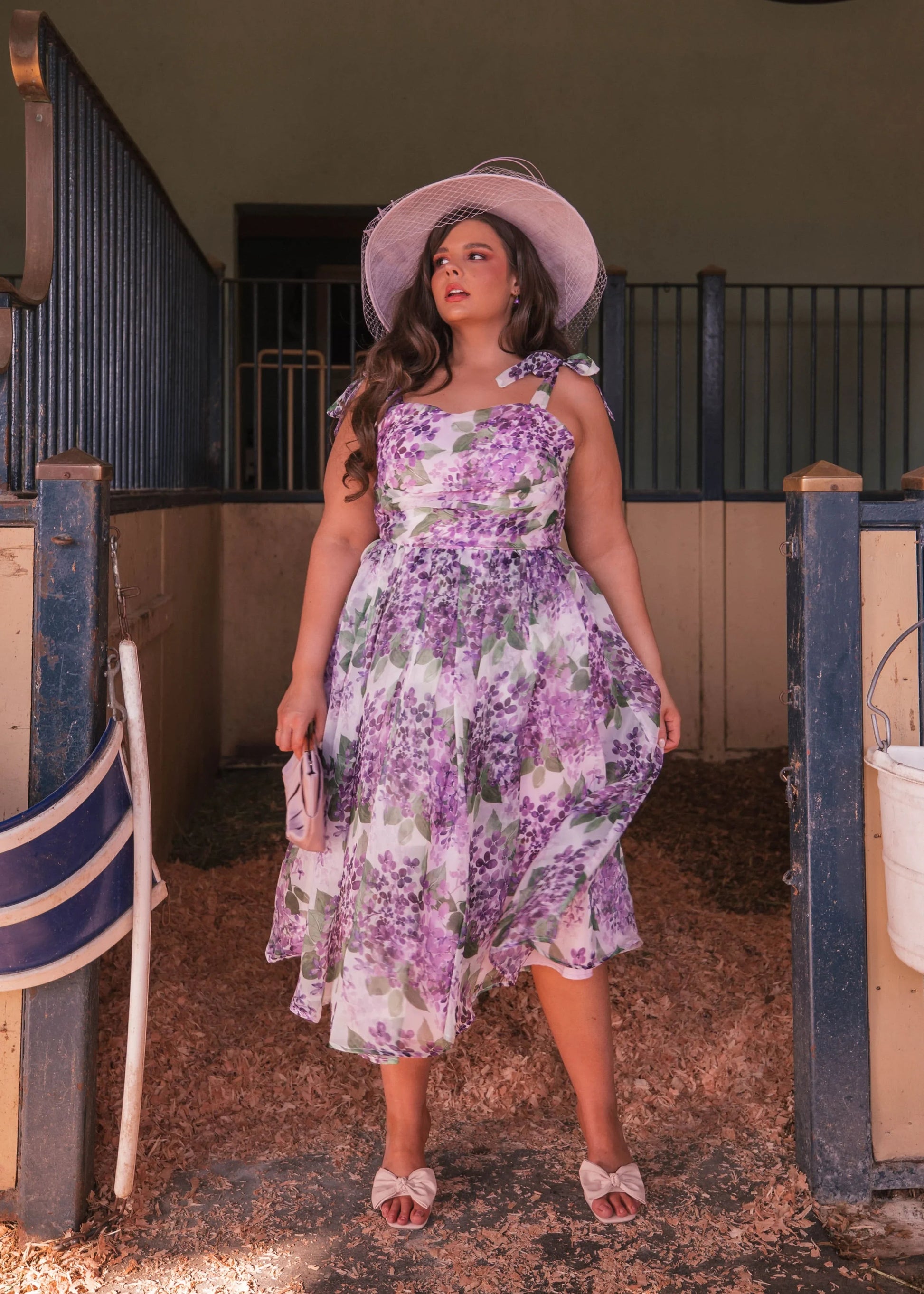 This exquisite midi dress is crafted from sheer organza fabric, showcasing a dreamy lilac pattern that exudes a gentle elegance. The dress features adjustable tie sleeves, which can be tied into pretty bows on the shoulders, adding a playful yet sophisticated touch. A charming sweetheart neckline enhances its feminine allure, making it an ideal choice for springtime events or elegant evening gatherings. The lightweight organza construction ensures a graceful flow with every step, perfect for making a lasting impression.