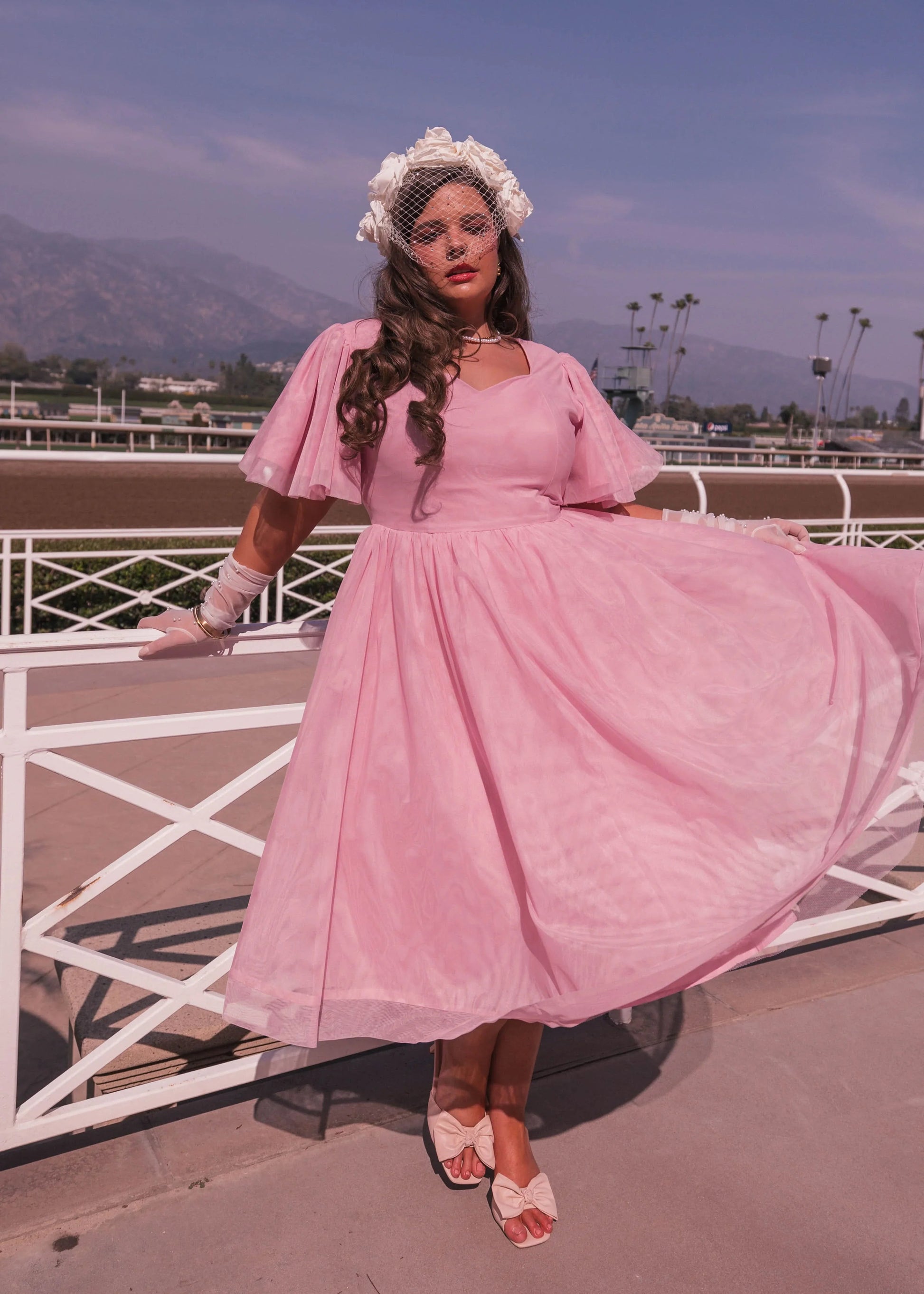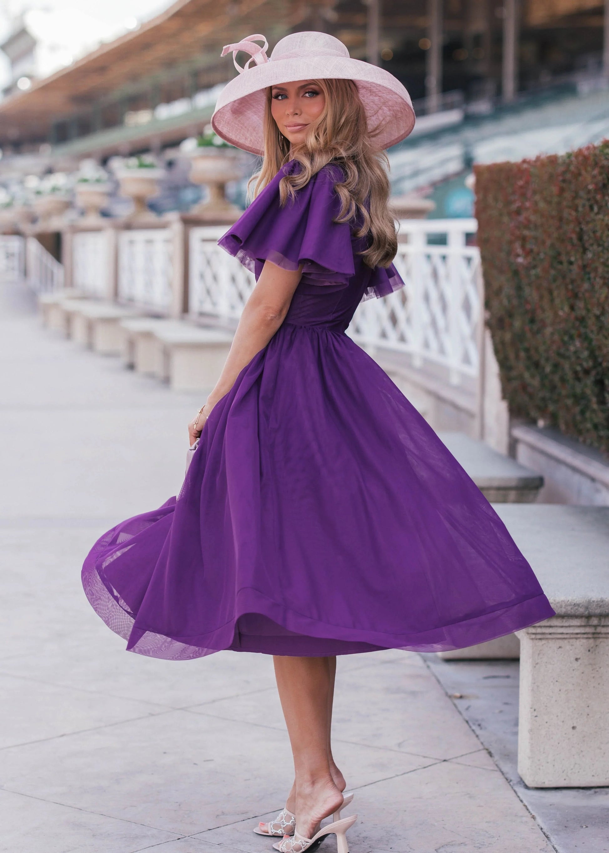 Introducing a captivating midi dress that combines playful elegance with a touch of whimsy. This charming ensemble features the vibrance of either pink or purple, designed to catch the eye and light up and room. The sweetheart neckline and flutter sleeves add a feminine flair, while the silhouette is perfect for twirling, making it ideal for spring gatherings or festive occasions. An expression of joy and free-flowing style, this dress is the perfect choice for sophisticated simplicity and for those who love to make a memorable entrance.
