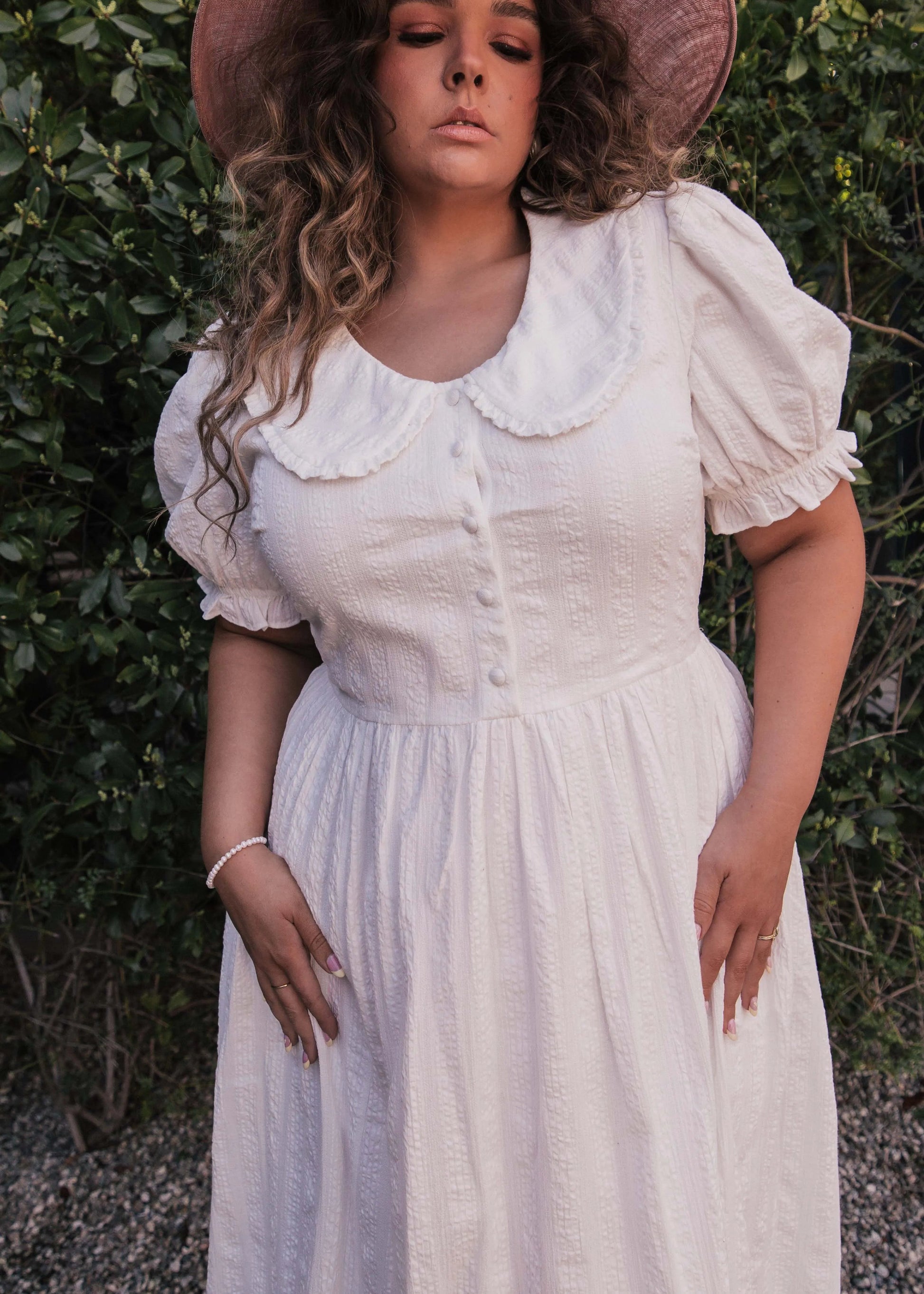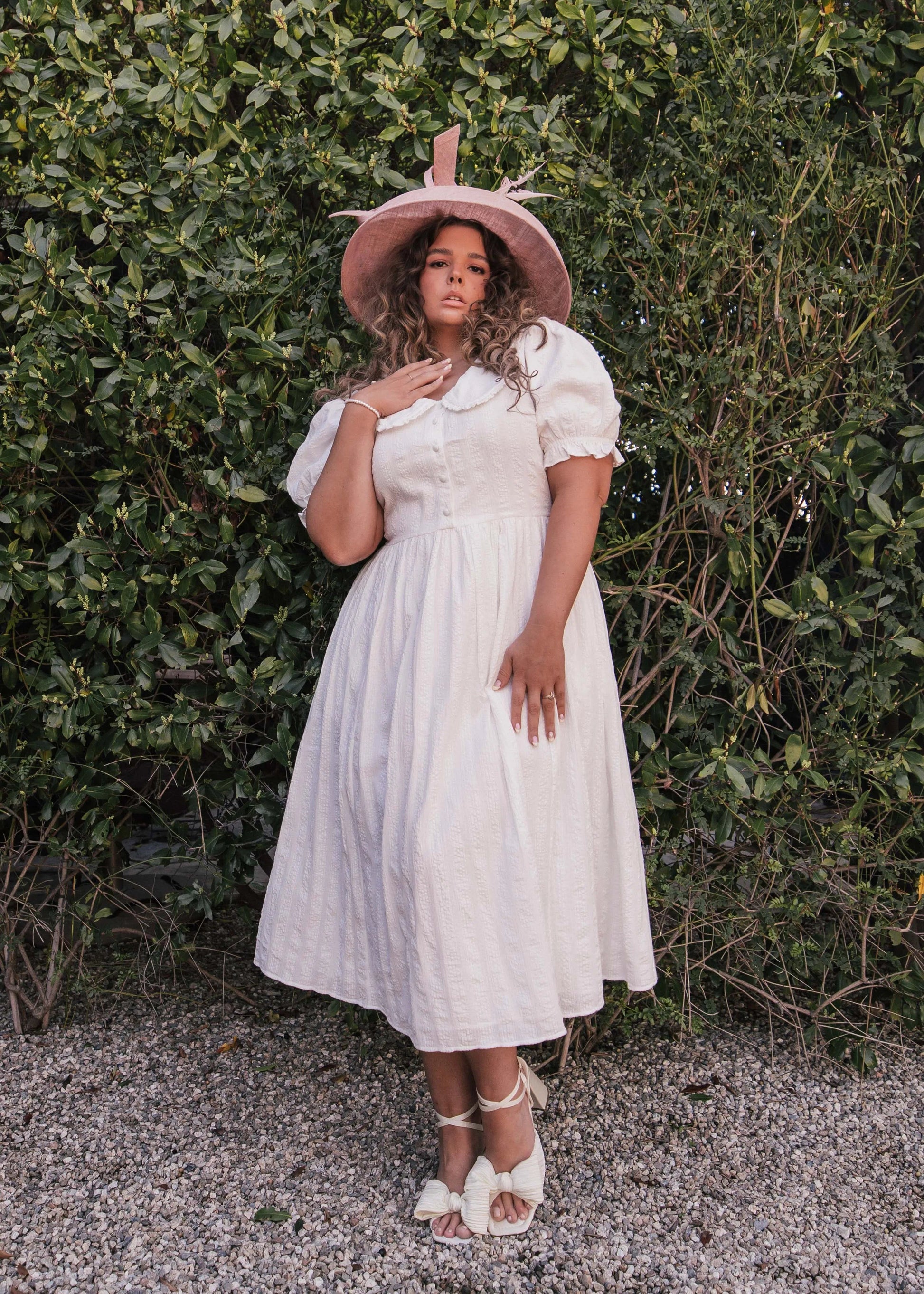 This simple and classic dress is perfect for all your upcoming spring and summer adventures. It features pockets, a detailed oversized collar, and functional buttons. The smocked back and elastic puff sleeves provide a comfortable and flattering fit for all body types. Perfect for a casual weekend brunch with the girls. Fully lined.