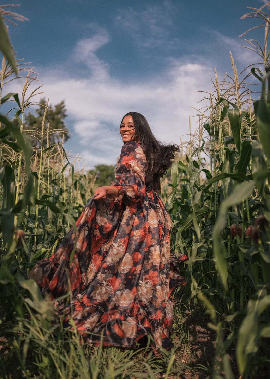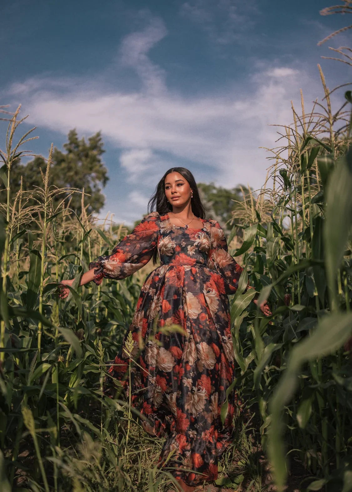 With its rich autumnal pattern and its flowing silhouette, the Sable Dress evokes the essence of a crisp evening in fall. Its elegant scoop neckline and voluminous sleeves bring vintage charm to this standout piece. Whether you're attending a formal event or a photoshoot for the season, this dress offers timeless beauty and effortless grace to any setting or occasion.
