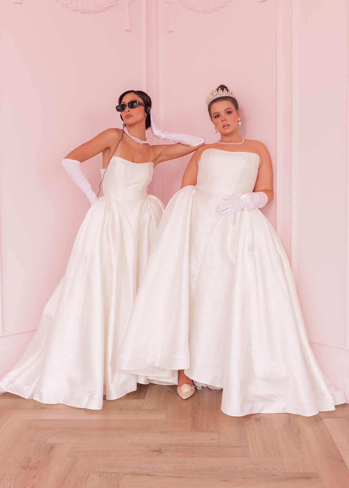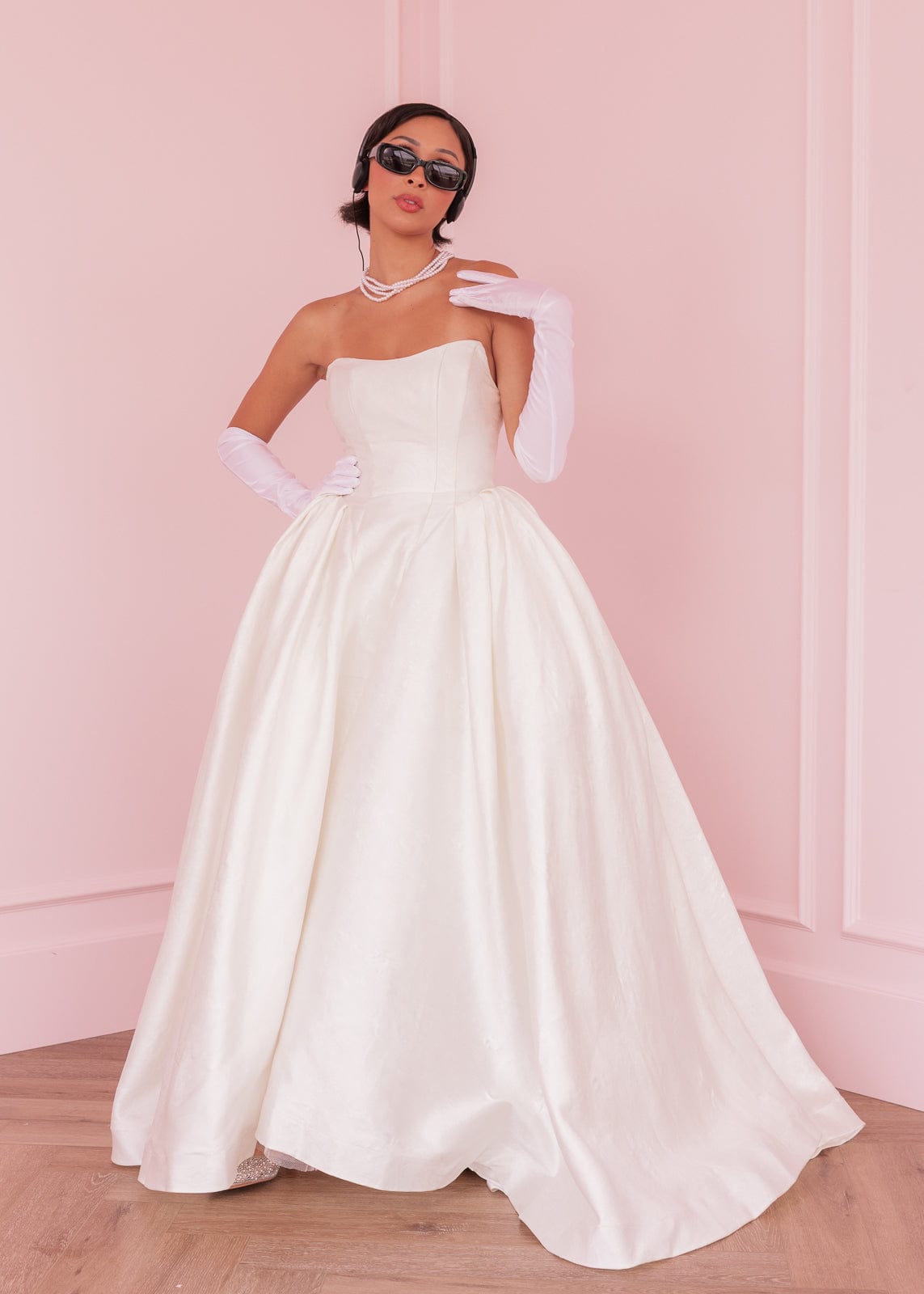 The Victoria Dress is a timeless showstopper with a modern edge. This structured strapless white gown features a sculpted bodice and a voluminous pleated skirt that creates a stunning A-line silhouette. Crafted from a subtle jacquard fabric, the Victoria is perfect for bridal events, formal occasions, or making a dramatic statement. Classic, sophisticated, and unforgettable — it’s a dress designed to turn heads. Looking for a wedding gown just as dramatic? Shop our Alba Dress and Margaret Dress.